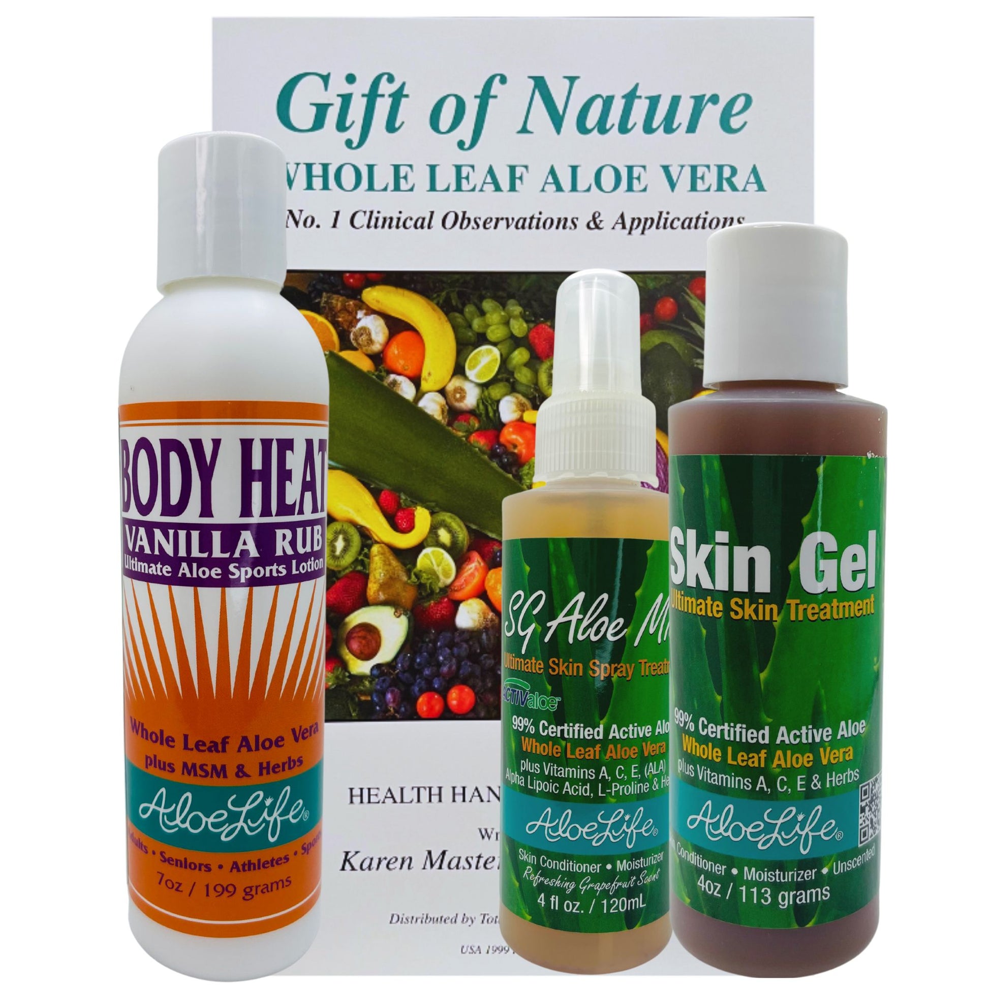 Give the gift of healthy, radiant skin 365 days a year with our specially curated bundle for Active Lifestyles : SG Aloe Mist 4oz, Skin Gel 4oz, Body Heat Vanilla Rub 7oz, and the Gift of Nature book by Karen Masterson-Koch! WL Aloe Vera, applied topically, offers a range of benefits from anti-aging and acne support to first-aid relief—perfect for those on the go. The Body Heat Vanilla Rub is ideal for active individuals & athletes, supporting soothing pain relief for sore muscles and injuries, all while leaving a pleasant, calming vanilla scent. Stay active, stay refreshed!