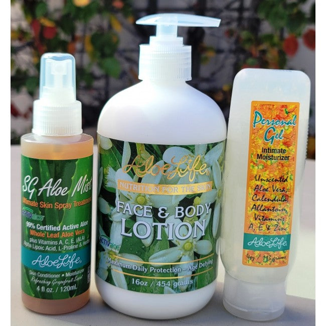 Gift of Health 365 Skin Gel Mist 4oz, Face and Body Lotion 16oz, Personal Gel 4oz., and Gift of Nature Book By Karen Masterson-Koch. Topically applied WL Aloe Vera has so many applications from anti aging support to acne support and first aid support! SG Aloe Mist makes it convenient to apply to delicate areas of the face and body especially great with sunburn support! Face and Body Nutrition for the Skin is free of common rancidity found in many lotions that can age skin, children and adults receive protective factors called antioxidants, minerals, amino acids and herbal extracts. Formulated for all skin types the emollient base of Lanolin, Macadamia Nut Oil and Jojoba oil blended with Vitamins A, C, E, Selenium and Zinc soothe, lubricate, protect and moisten the skin likened to the body's own natural oils.The natural grapefruit scent is non irritating great for men and women and it works wonderfully on very sensitive skin, even babies! Personal Gel Intimate Moisturizer 4oz is a silky non staining formula that adds moisture and protection to dry sensitive skin naturally. A favorite of Active Men and Women for intimacy, menopausal women, moms (post child birth), etc. Topically applied WL Aloe Vera has so many applications from anti aging support to acne support and first aid support!